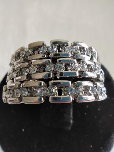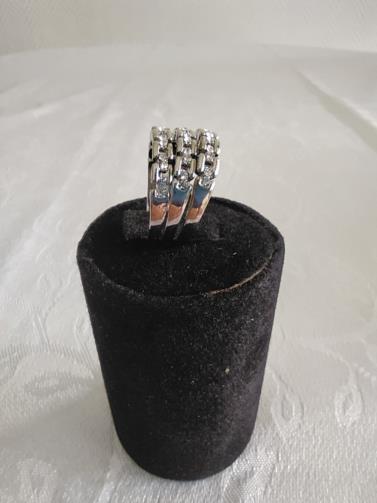 Três anéis em metal prateado cravejados de pedras de brilho podendo usar todos em um dedo ou de forma separada ( um em cada dedo ). Nº18