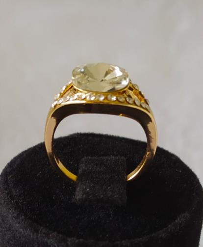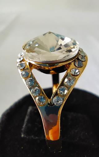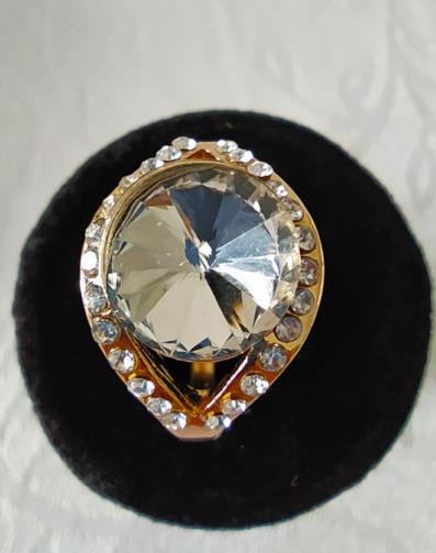 - Anel em metal dourado em forma de olho cravejado de pedras de brilho e uma pedra transparente brilhosa no centro. Nº18