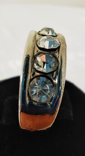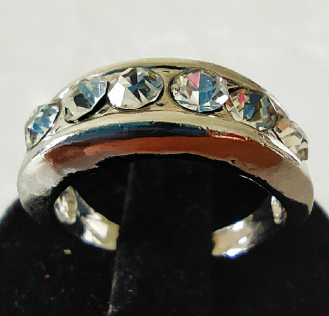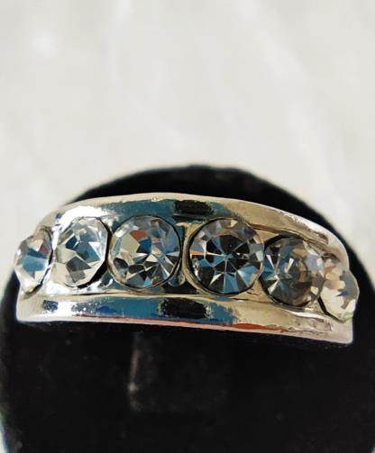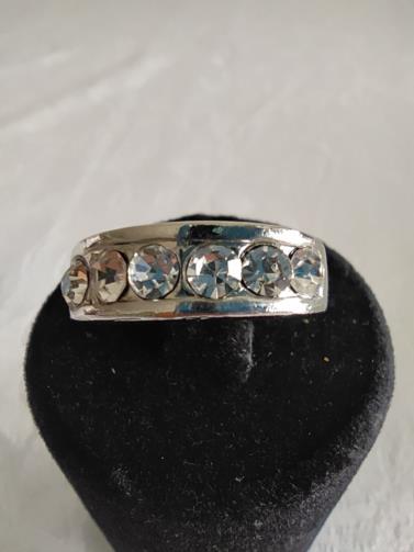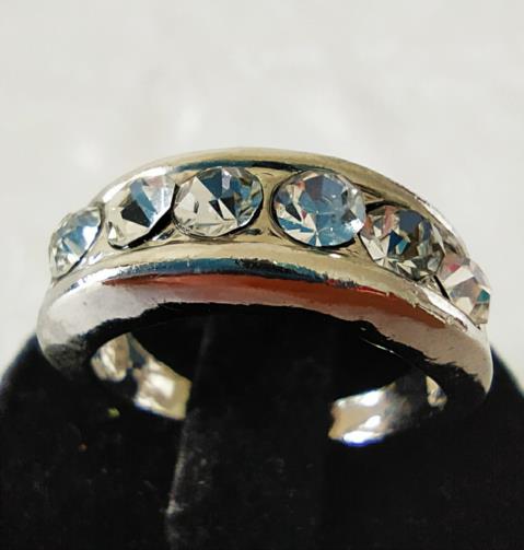 Anel em metal prateado cravejado de pedras de brilho. Nº18