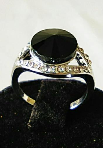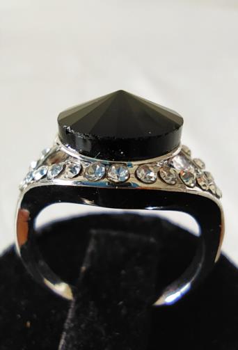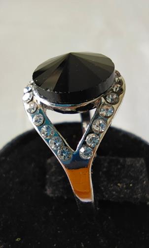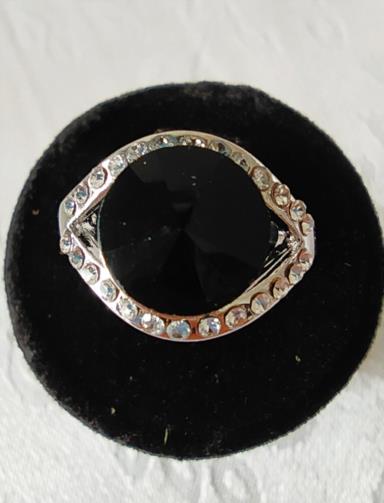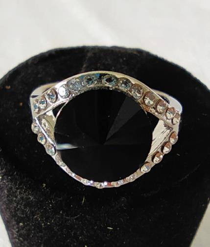 Anel em metal prateado em forma de olho cravejado de pedras de brilho e uma pedra preta no centro. Nº18