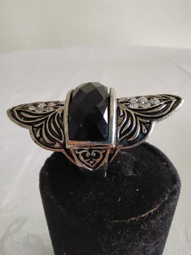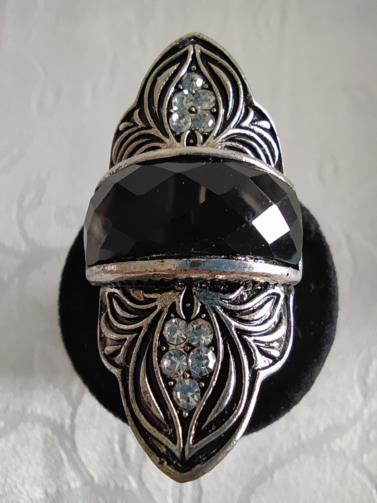 Anel em metal prateado em gramatura estilo tribal cravejadas de pedras de brilho com uma pedra preta sobreposta. Nº18