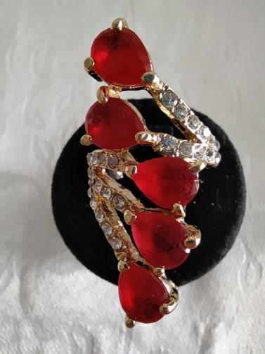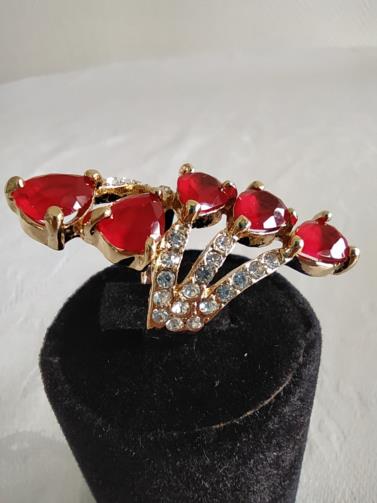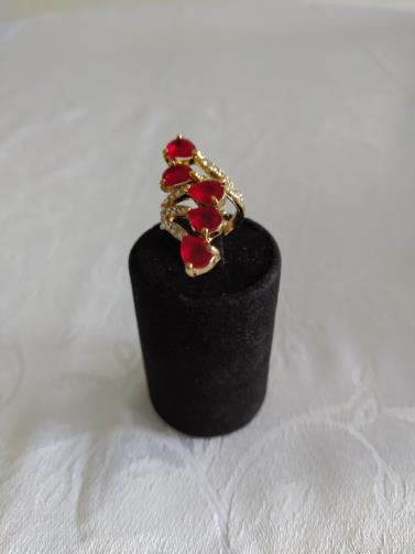 Anel Triplo indexado em metal dourado cravejado de pedras de brilho com cinco pedras vermelhas em forma de gota sobrepostas. Nº18