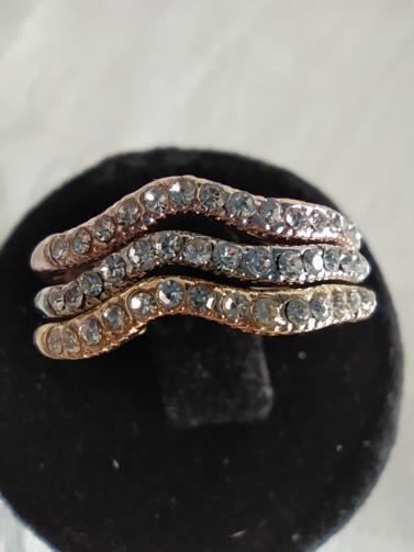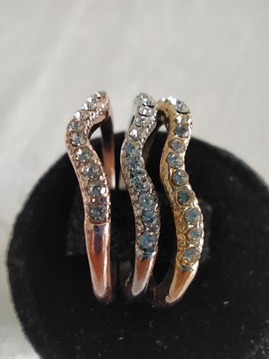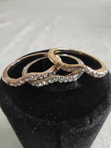 Três anéis de cores diferentes ( metal dourado, metal prateado, metal rose) cravejados de pedras de brilho em forma estilo. Nº18
