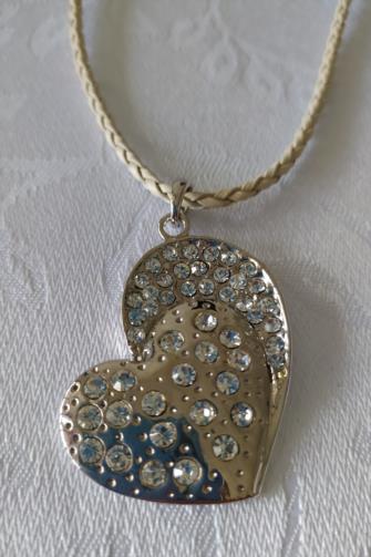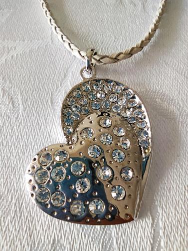 Colar em Couro Sintético em cor areia medindo 44 cm com um pingente em metal prateado de Coração Estilizado cravejado de pedras de brilho medindo 5,0 cm.