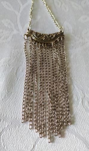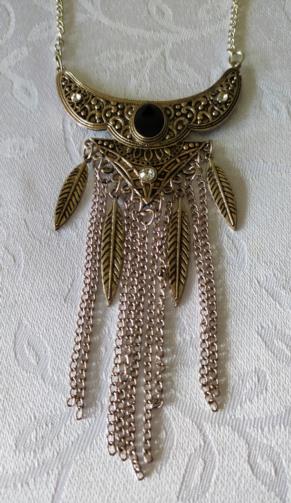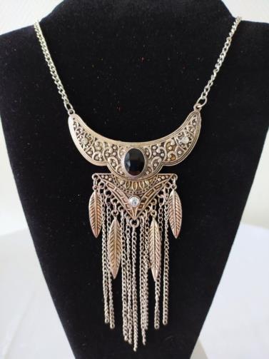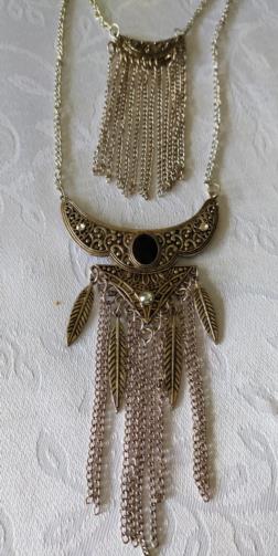 Colar Duplo em metal prateado medindo 50,0cm e 70,0cm respectivamente. O primeiro tem uma placa de metal em gramatura com 13 flagelos em correntes medindo 8,0cm cada , o segundo com uma placa de metal em gramatura com uma pedra preta e pedras de brilho com 9 flagelos em correntes e 4 pingentes em forma de penas prateadas.