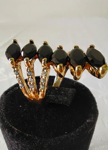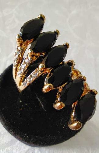 Anel Triplo indexado em metal dourado cravejado de pedras de brilho com seis pedras pretas em forma de gota sobrepostas. Nº18
