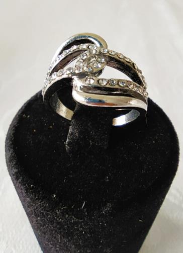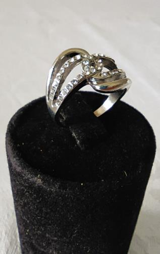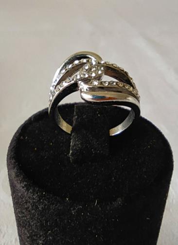 Anel em metal prateado entrelaçado com pedras de brilho. Nº18