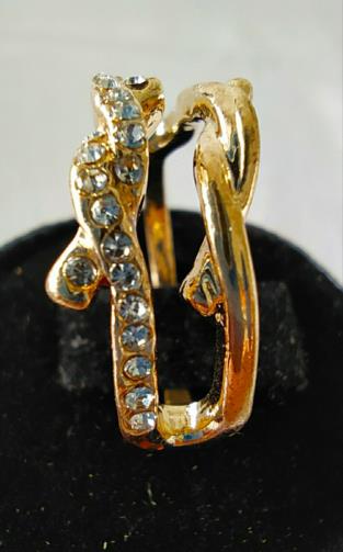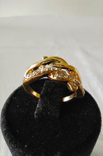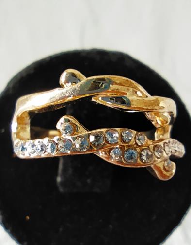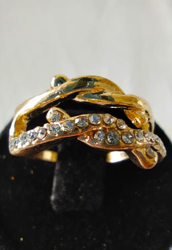 Anel em metal dourado retorcido em estilo cravejado de pedras de brilho. Nº18