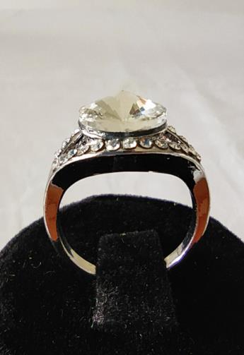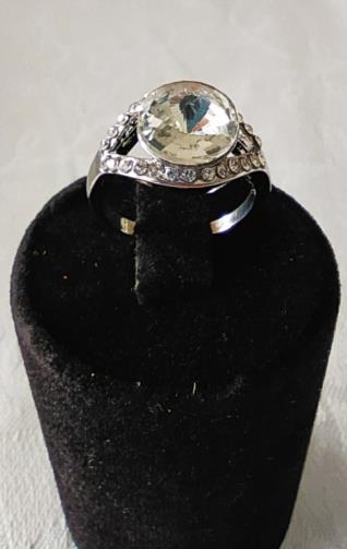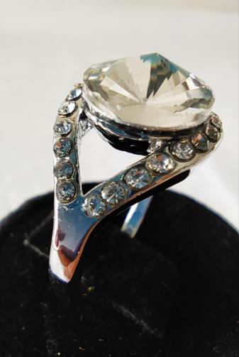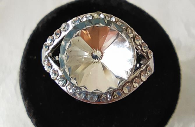 Anel em metal prateado em forma de olho cravejado de pedras de brilho e uma pedra transparente brilhosa no centro. Nº18