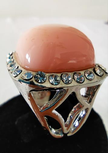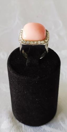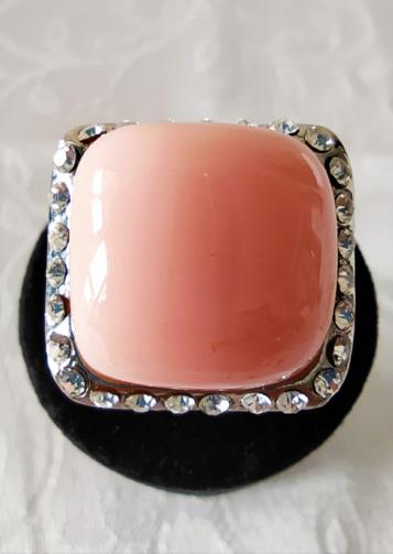 Anel em metal prateado de forma quadrada cravejado de pedras de brilho com uma pedra central de forma quadrada de cor Rosa. Nº18