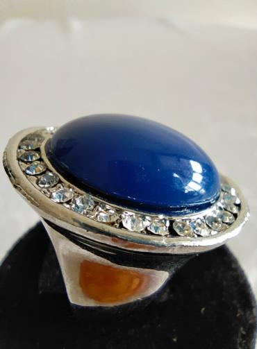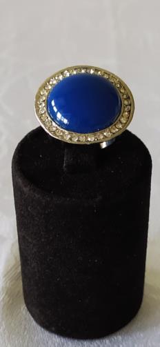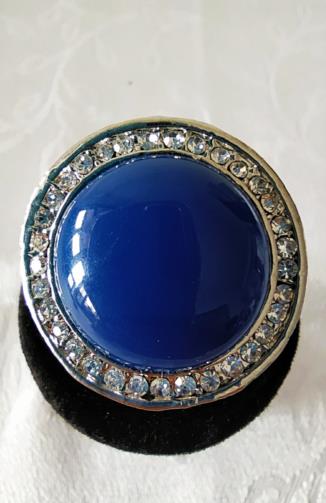 Anel em metal prateado em forma de disco cravejado de pedras de brilho com uma pedra redonda central de cor Azul Royal. Nº18
