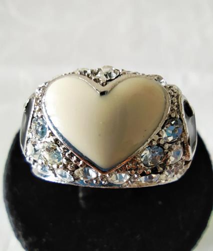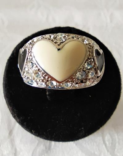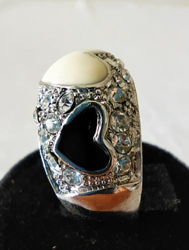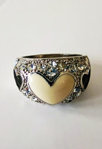 Anel em metal prateado cravejado de pedras de brilho com três corações em pedras. Na parte central um coração branco e nas laterais dois corações pretos. Nº18