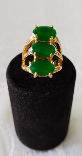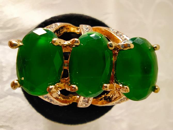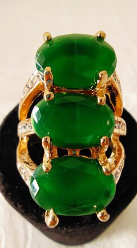 Anel triplo indexado de metal dourado cravejado de pedras de brilho com três pedras verdes despojadas no centro. Nº18