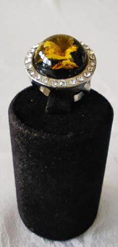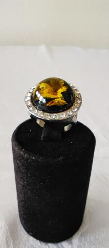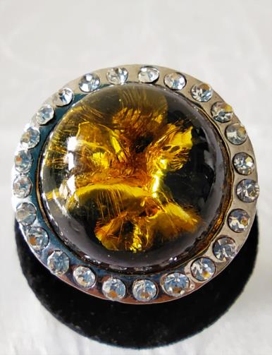 Anel em metal prateado vazado na lateral cravejado de pedras de brilho com uma pedra redonda central de efeito Preta com tons dourados. Nº18