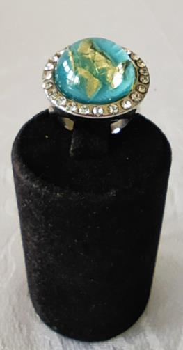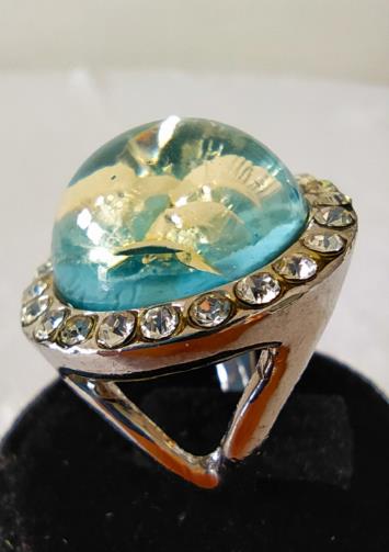 Anel em metal prateado vazado na lateral cravejado de pedras de brilho com uma pedra redonda central de efeito Azul com tons prateados.Nº18