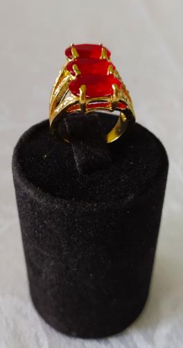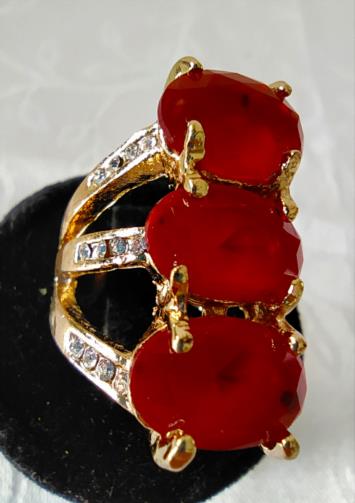Anel triplo indexado de metal dourado cravejado de pedras de brilho com três vermelhas verdes despojadas no centro. Nº18