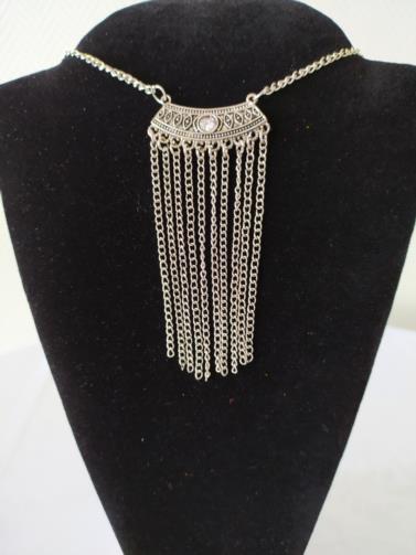 Cordão Duplo em metal prateado com duas plataformas em gramatura medindo 70cm, a primeira com uma pedra preta com 10 flagelos em correntes medindo 9cm, a segunda com 11 flagelos e 4 pingentes em forma de Pena em metal prateado.