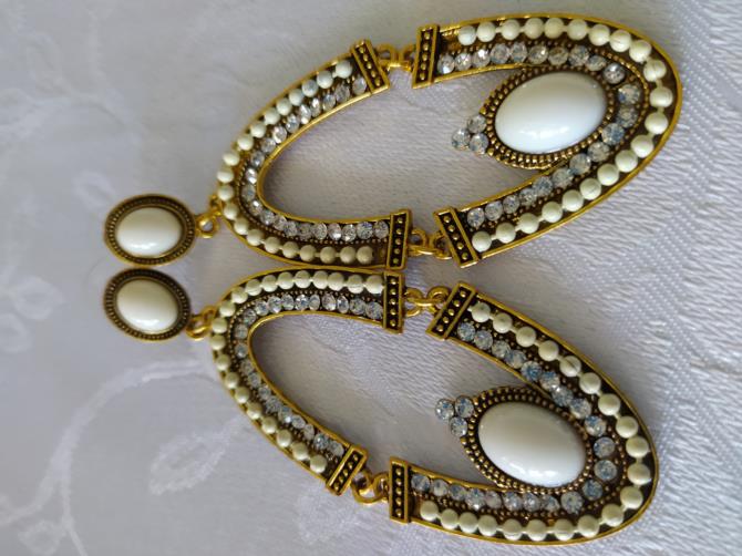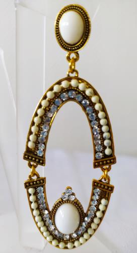 Peça em metal dourado articulado em forma oval medindo 6,5cm cravejado de pedras de brilho e na cor branca.