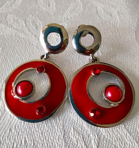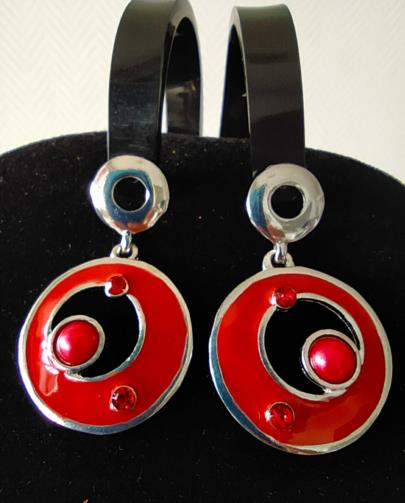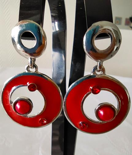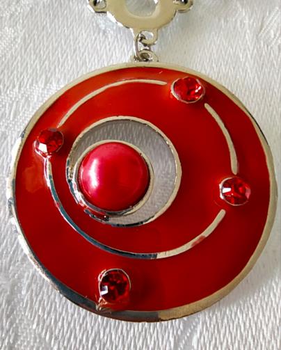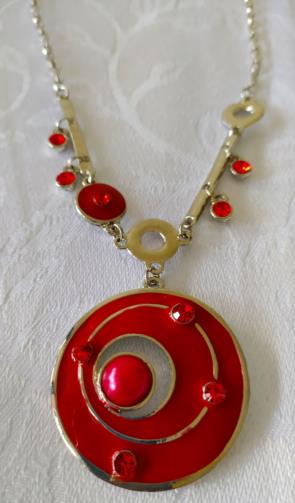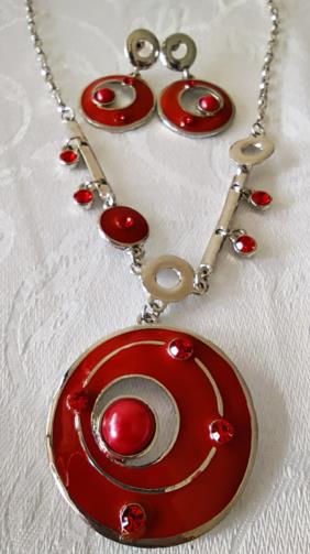 Cordão em metal prateado estilizado com pedras de brilho vermelho com pingente em forma de disco estilizado na cor vermelha com pedras de brilho vermelhas medindo 48cm. Brincos em metal prateado em forma de disco estilizado na cor vermelha com pedras de brilho vermelhas medindo 4,0cm.