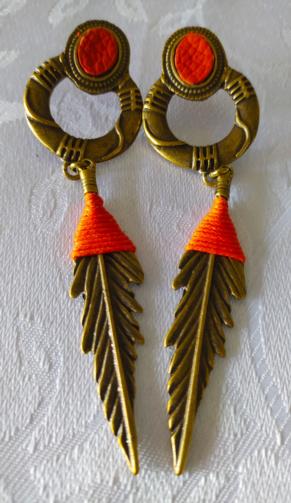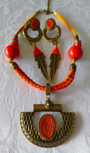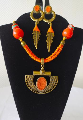 Cordão em couro sintético e camurça na cor laranja medindo 45cm ( ajustável +10cm) e peças douradas em gramatura e couro sintético de cor laranja detalhada em adornos. Brinco em metal dourado em adorno com couro sintético na cor laranja com pingente em forma de Pena estilizada com sisal na cor laranja medindo 11 cm.