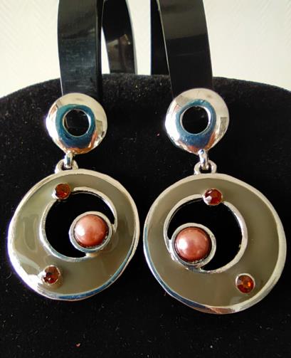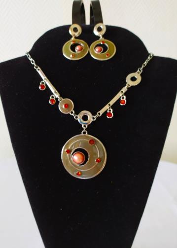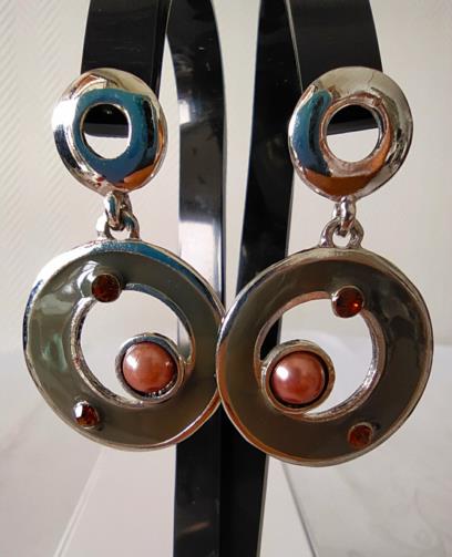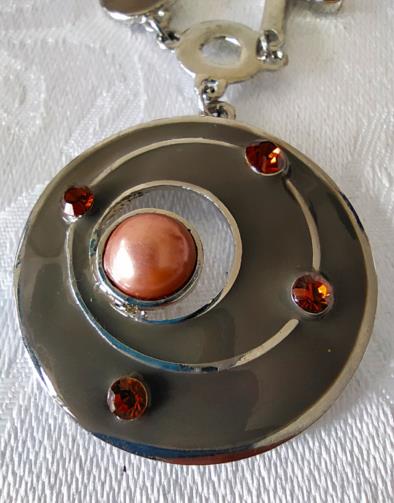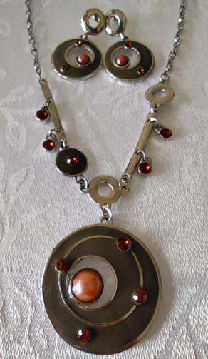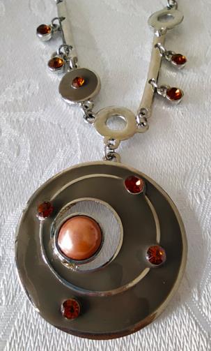 Cordão em metal prateado estilizado com pedras de brilho marrom com pingente em forma de disco estilizado na cor verde com pedras de brilho marrom medindo 48cm. Brincos em metal prateado em forma de disco estilizado na cor verde com pedras de brilho marrom medindo 4,0cm.