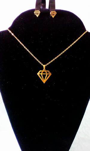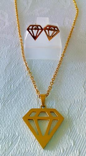 Cordão em aço inoxidável 316L dourado medindo 42cm com pingente em forma de diamante em aço inox dourado medindo 2,5cm. Brinco em aço inox dourado na forma de diamante medindo 1,0cm.