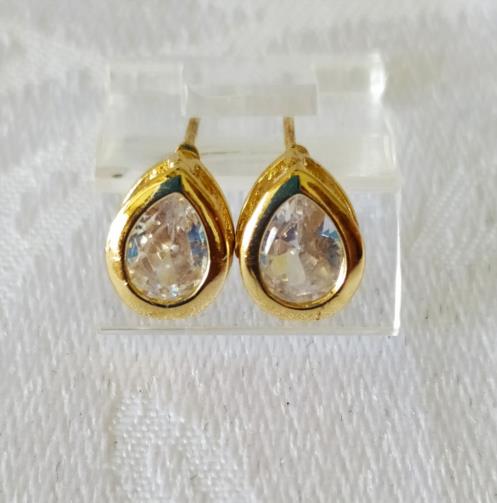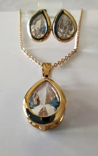 Cordão em metal dourado medindo 42cm com um pingente em estrutura de metal dourado em forma de gota com uma pedra de brilho dentro medindo 1,5cm. Brinco de estrutura de metal dourado em forma de gota com uma pedra de brilho dentro medindo 1,0cm.