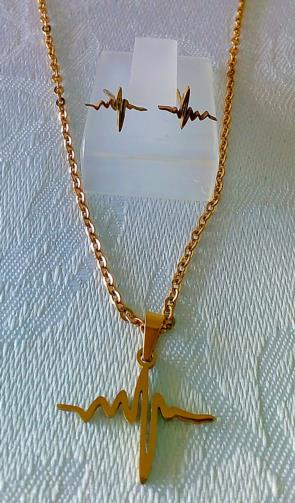 Cordão em aço inoxidável 316L dourado medindo 42cm com pingente com símbolo cardíaco em aço inox dourado medindo 1,0cm. Brinco em aço inox dourado na forma de símbolo cardíaco medindo 1,0cm.