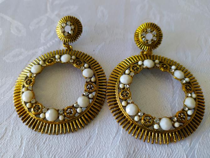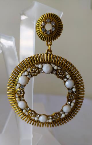 Peça em metal dourado em forma de argola estilizada em gramatura cravejada de pedras de brilho e pedras brancas medindo 7cm.