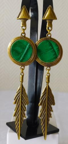 Brinco em metal dourado em adorno com couro sintético na cor verde com pingente em forma de Pena estilizada com sisal na cor verde medindo 11 cm.