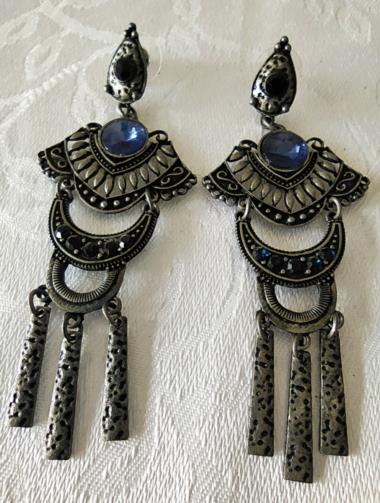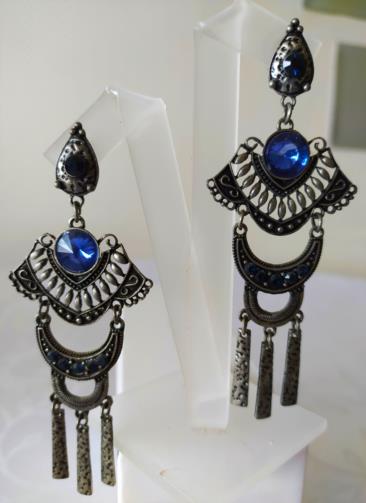 Peça em metal cor de cinza escuro em gramatura cravejadas de pedras pretas e uma pedra azul com três pingentes medindo 9,0 cm.
