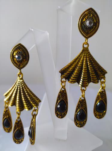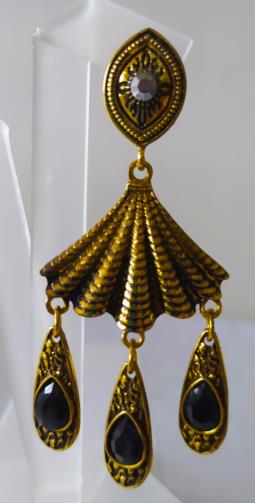 Peça em metal dourado em forma de leque estilizado em gramatura com uma pedra de brilho e três pingentes com pedras pretas medindo 8cm.