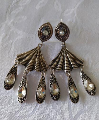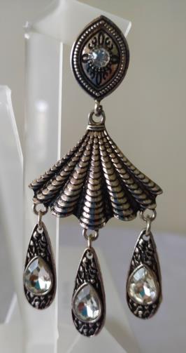 – Peça em metal prateado em forma de leque estilizado em gramatura com uma pedra de brilho e três pingentes com pedras de brilho medindo 8cm.