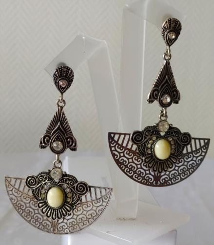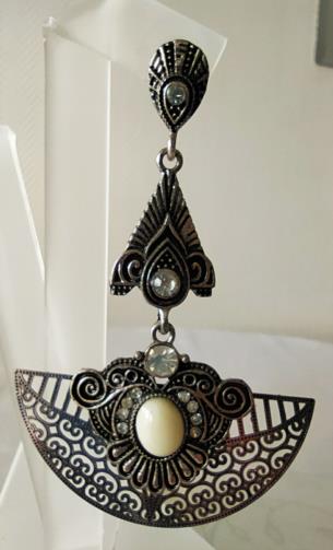 Peça em metal prateado e aço em forma de leque estilizado cravejado de pedras de brilho e pedras brancas medindo 8,0 cm.