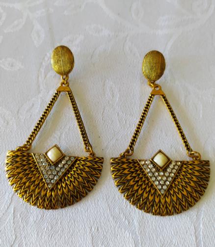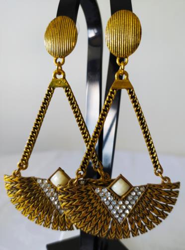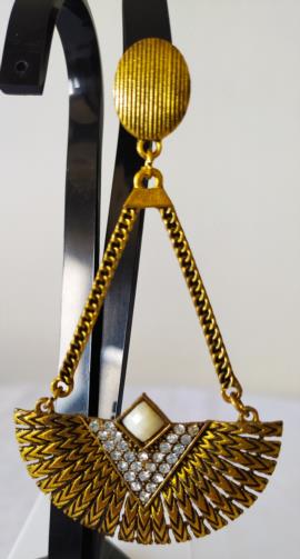 Peça em metal dourado em forma de leque estilizado cravejado de pedras de brilho e pedra branca medindo 9,0 cm.