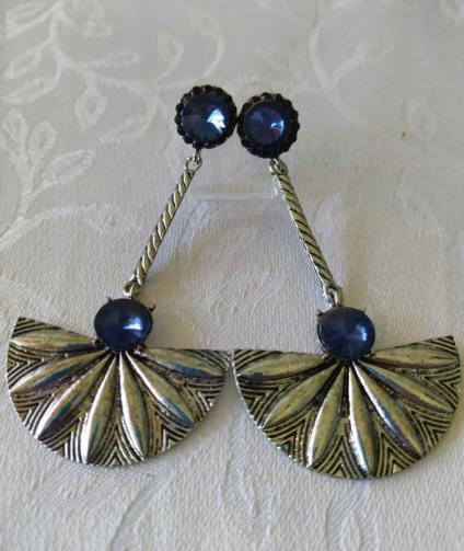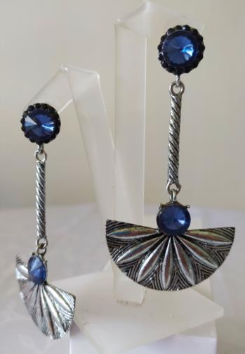 .Peça em metal prateado com haste em forma de leque com duas pedras azuis brilhantes medindo 9,0cm.