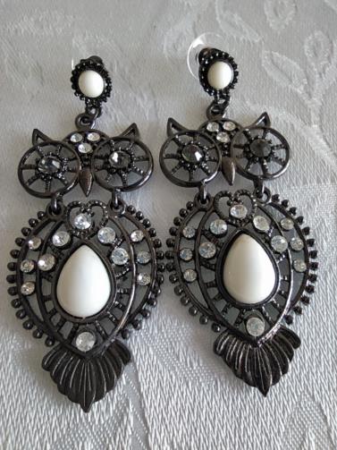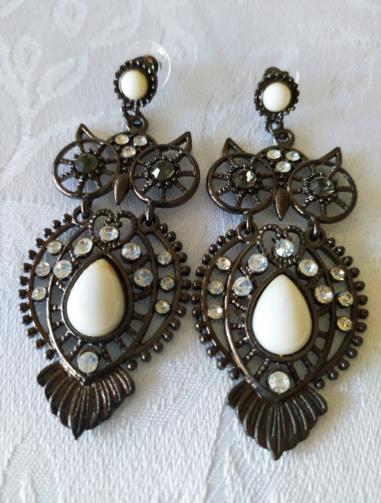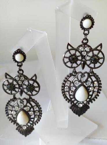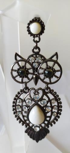 Peça em metal na cor ônix em forma de coruja medindo 7,5m cravejadas de pedras de brilho e pedras brancas.
