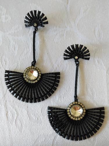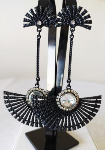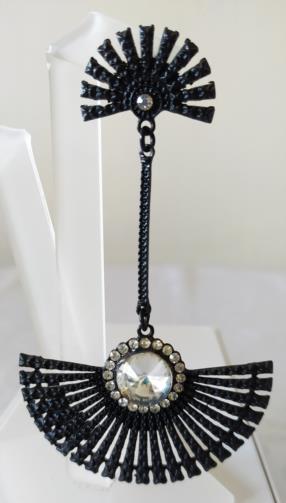 Peça em metal na cor preta medindo 10,0cm em forma de leque com haste cravejado de pedras de brilho e uma pedra transparente brilhante no centro.