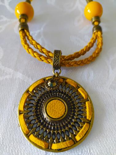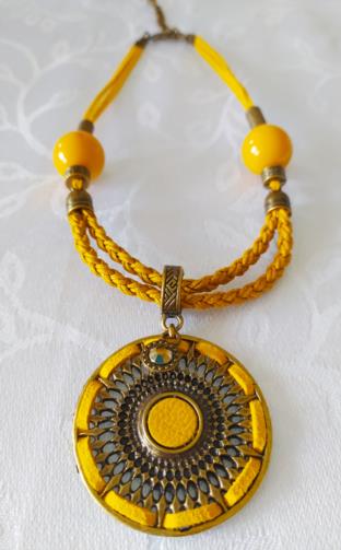 Peça em couro sintético e camurça de cor amarela, adornado em metais dourados trabalhados em gramatura com pedra de efeito dourada e acabamentos medindo 42cm ajustável (+6cm).