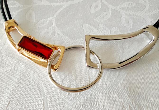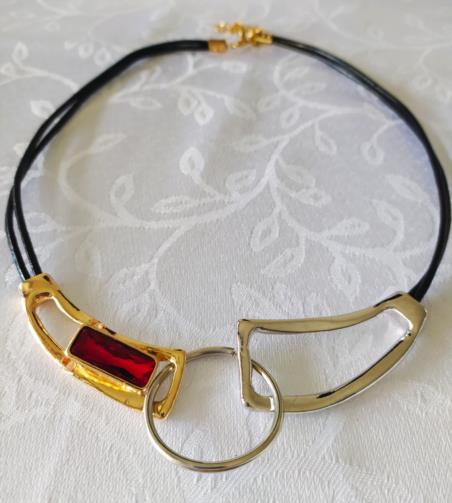 Peça em couro duplo na cor preta medindo 52cm ajustável (+8cm) adornados com peças em metais douradas e prateadas de forma arquitetônicas com uma pedra vermelha retangular.