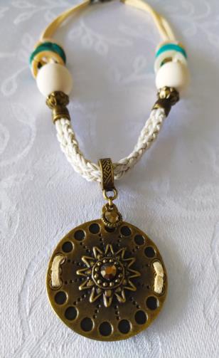 Peça em couro sintético e camurça de cor branca, adornado em metais dourados trabalhados em gramatura com pedra de efeito dourada com um disco de metal dourado contendo um Sol estilizado no centro com uma pedra de brilho(4,5cm) acabamentos medindo 42cm ajustável (+6cm).