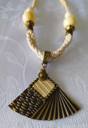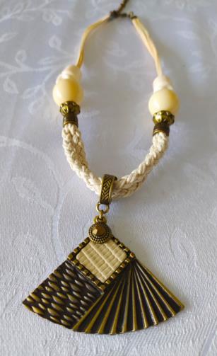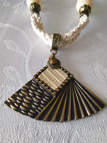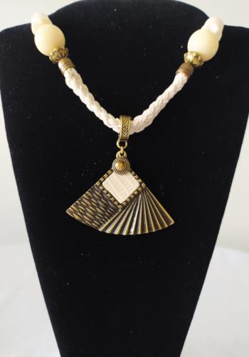Peça em couro sintético e camurça de cor branca, adornado em metais dourados trabalhados em gramatura com pedra de efeito dourada com um leque de metal dourado estilizado com couro no centro com uma pedra de brilho(4,5cm) acabamentos medindo 42cm ajustável (+6cm).