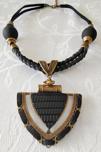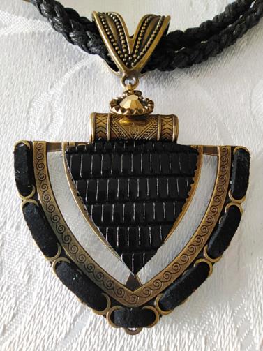 Peça em couro sintético e camurça de cor preta, adornado em metais dourados trabalhados em gramatura com pedra de efeito dourada e acabamentos medindo 42cm ajustável (+6cm).
