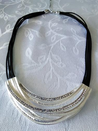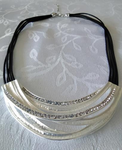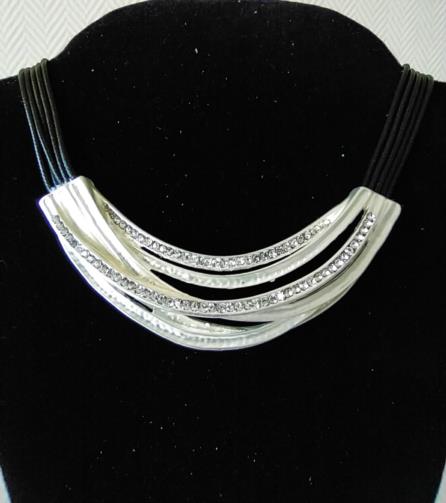 Colar em couro sintético de cor preto medindo 45 cm com uma estrutura de metal prateada retorcida em estilo cravejadas de pedras de brilho de 9,5cm e acabamentos em metal prateado.