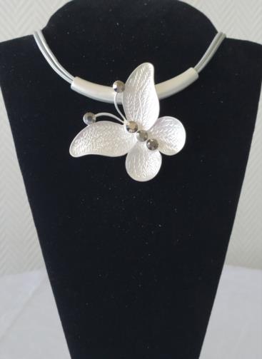 Colar em couro sintético de cor prata medindo 45 cm com uma estrutura de metal prateado de 9cm em forma de Borboleta em gramatura adornada em pedras de brilho ônix.