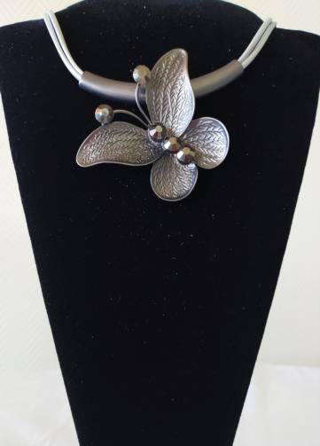 Colar em couro sintético de cor prata medindo 45 cm com uma estrutura de metal ônix de 9cm em forma de Borboleta em gramatura adornada em pedras de brilho.