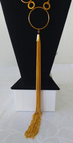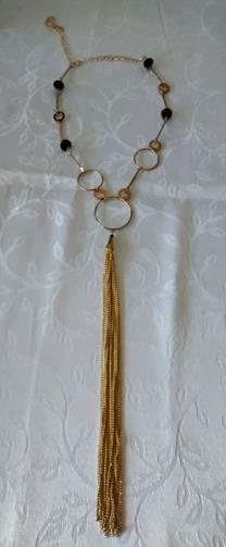 Colar em metal dourado disposta em argolas e hastes em metal dourado e pedras pretas medindo 52cm ajustável (+15cm) acrescentando em seu final 9 flagelos em correntes douradas medindo 23cm.