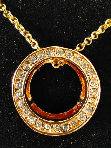 Colar em metal dourado medindo 42cn com um pingente adorno em estrutura dourada circular cravejado de pedras de brilho medindo 2cm.