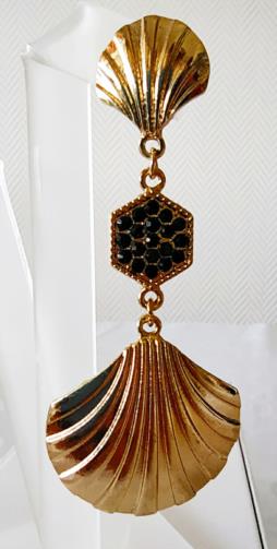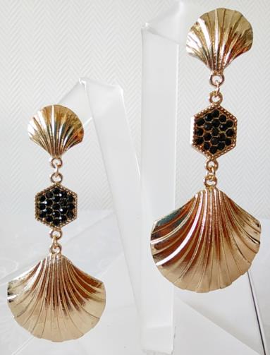 Peça em metal dourado em forma de concha com pedras de brilho pretas medindo 8,0cm.