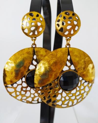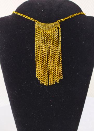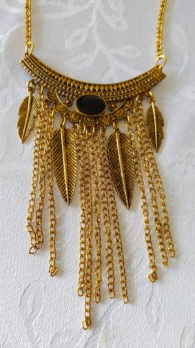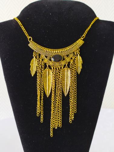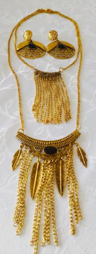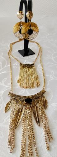 Cordão em metal dourado medindo 48cm e 72cm respectivamente com placas detalhadas em gramatura. A primeira com treze flagelos em correntes e a segunda com onze flagelos em correntes e quatro pingentes em forma de penas douradas com uma pedra preta de brilho no centro. Brincos em metal dourado retorcido em forma de escudo medindo 7,0cm com uma pedra de brilho preta.